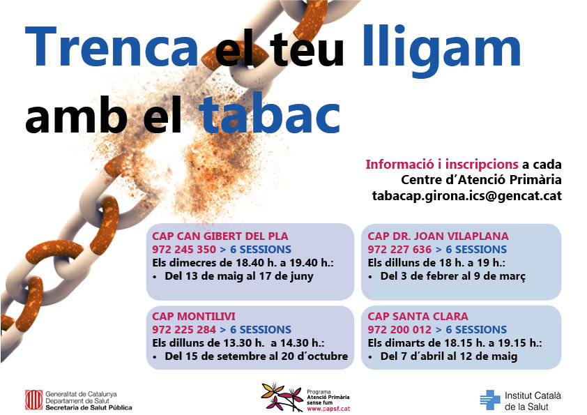 Als Centres d'Atenció Primària, CAP Can Gibert del Pla, CAP Dr. Joan Vilaplana, CAP Montilivi i CAP Sta. Clara està previst la realització de diversos grups de Deshabituació Tabàquica als quals poden assistir aquelles persones que vulguin deixar el tabac o estiguin fent un procés de deshabituació.