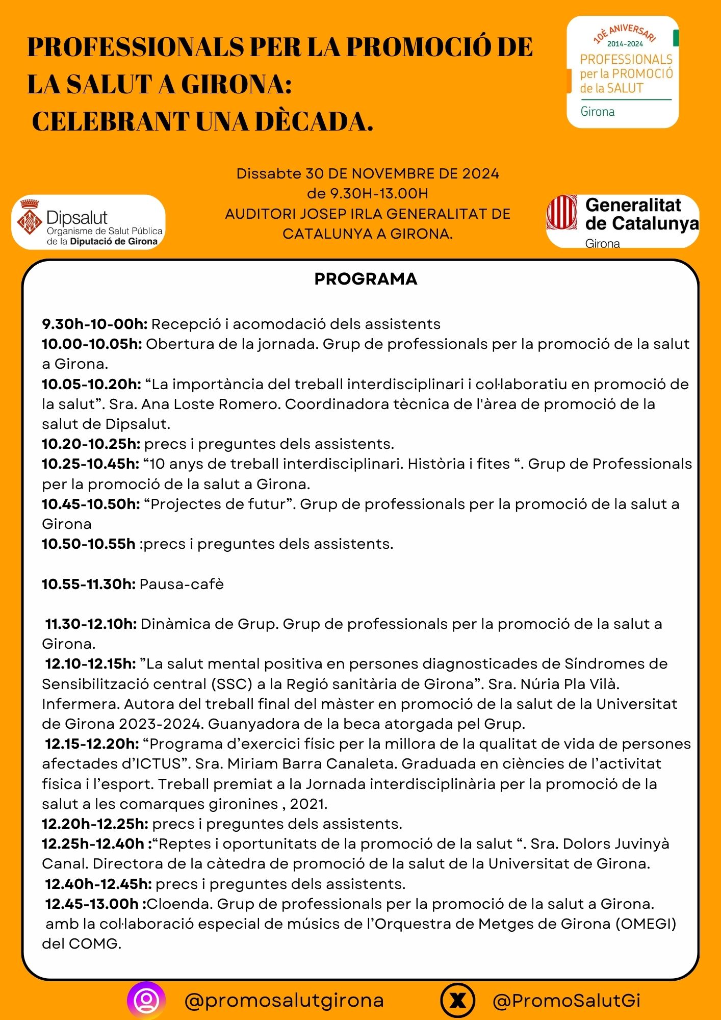 El proper dissabte 30 de novembre de 2024, de 9:30 a 14h, tindrà lloc a l'Auditori Josep Irla de Girona la celebració de les jornades commemoratives dels deu anys de dedicació i compromís amb la promoció de la salut a la nostra ciutat.