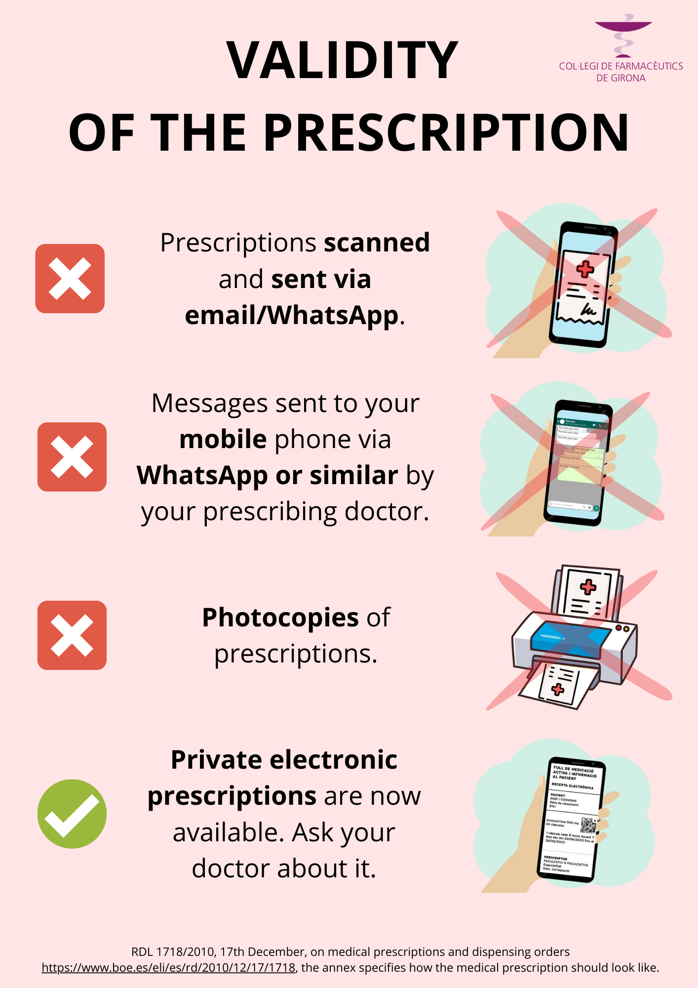 Adjunt, trobareu una infografia (en format PDF i imatge), elaborada pel COFGi, del que es pot considerar recepta mèdica vàlida i del que no. Esperem que us pugui ser útil.