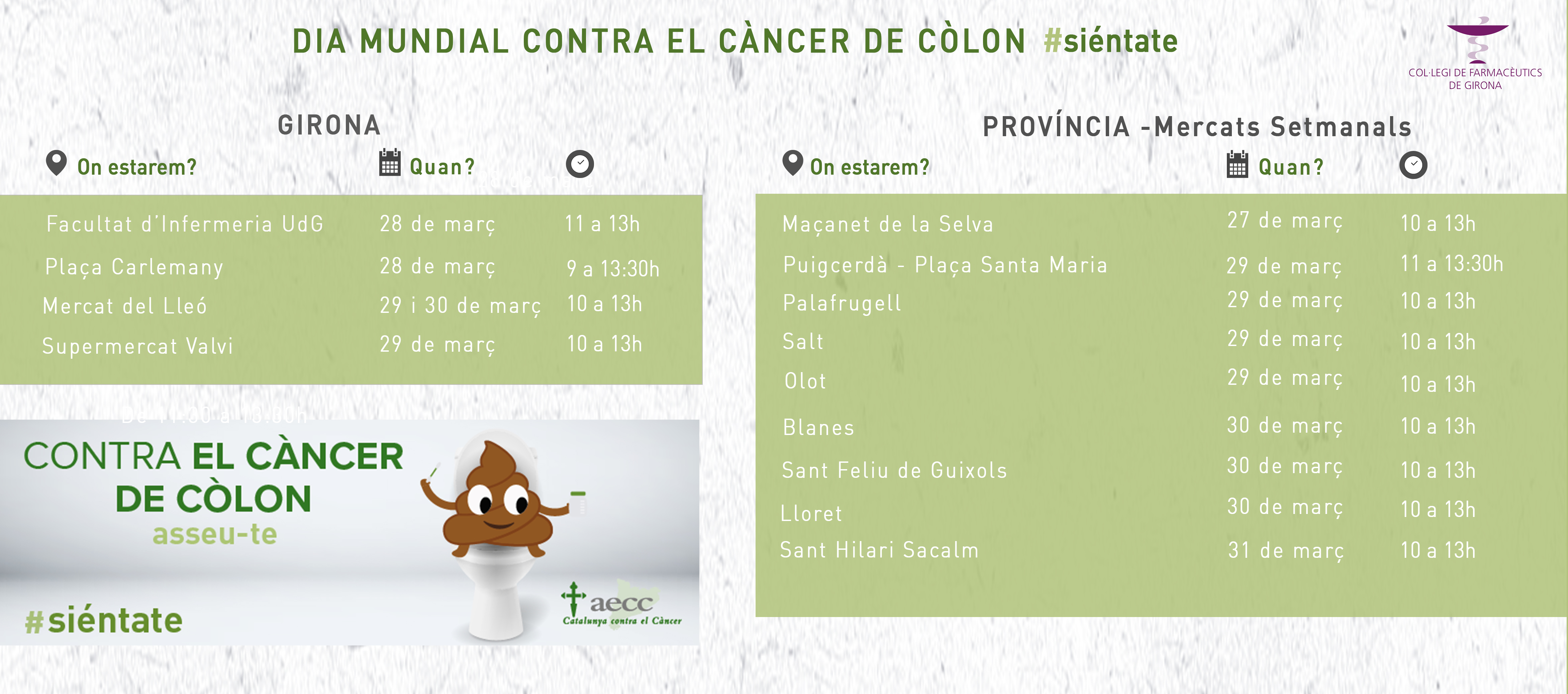 El proper dia 31 de març, es celebra el Dia Mundial contra el càncer de còlon. Per aquest motiu l'AECC - Catalunya contra el Càncer Girona, ha organitzat diferents taules informatives en diferents municipis de la nostra província.