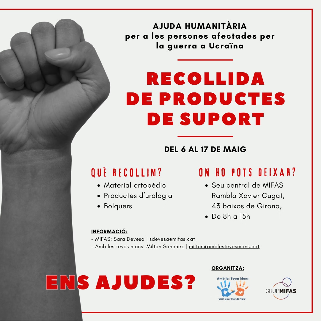 Campanya conjunta que ha iniciat l’associació MIFAS i “amb les teves mans” per recollir material ortopèdic, productes d’urologia i bolquers per a les víctimes de la guerra d’Ucraïna. Tot el material recollit es podrà portar a: